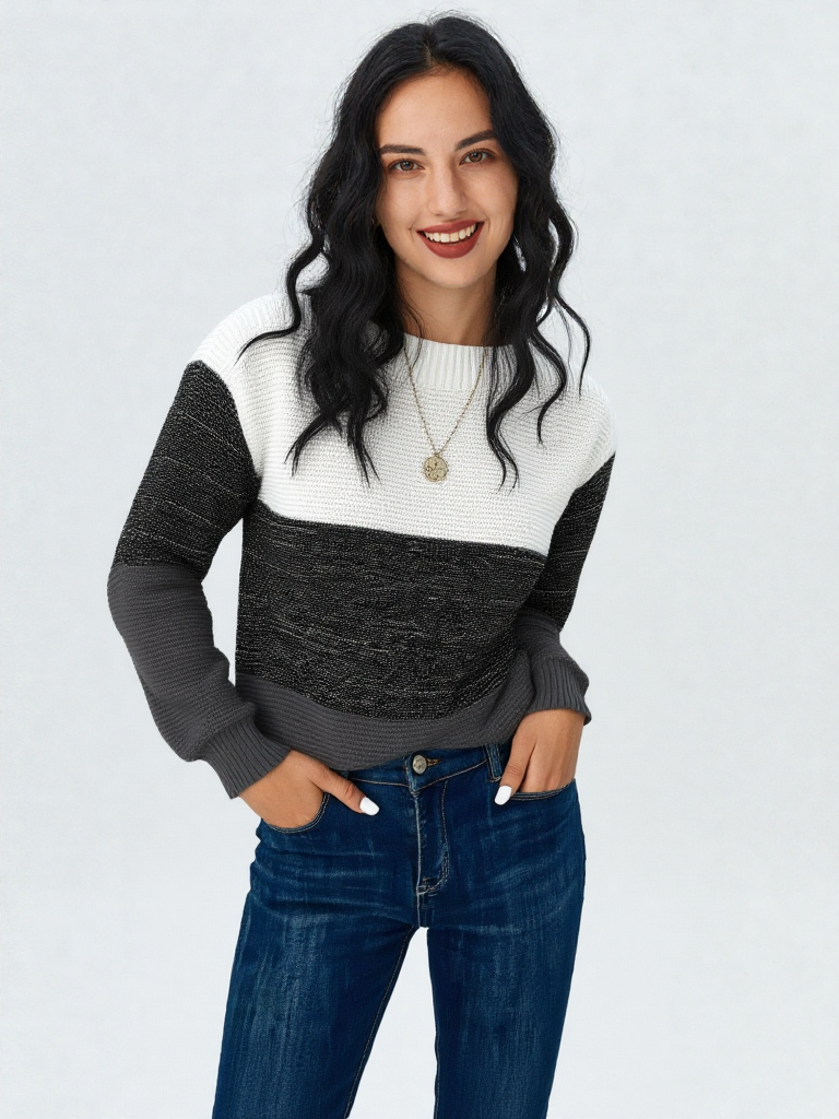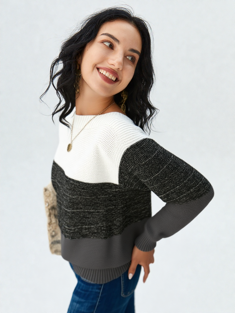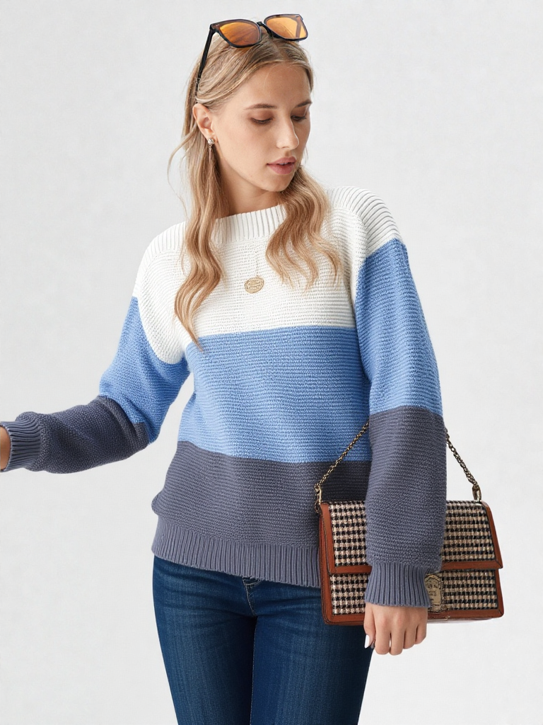 Strikket dametrøje med løs pasform og rund halsudskæring. Designet har et stribet patchwork-mønster og en enkel slidsdetalje, som giver et rent og afslappet udtryk. Pull-on modellen kan styles med jeans, bukser eller lag-på-lag looks i efterårs- og vintersæsonen.